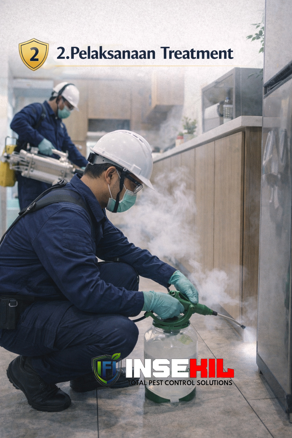 Teknisi profesional menjalankan tindakan pengendalian menggunakan metode Integrated Pest Management (IPM), peralatan modern, dan bahan yang aman bagi manusia serta lingkungan.
